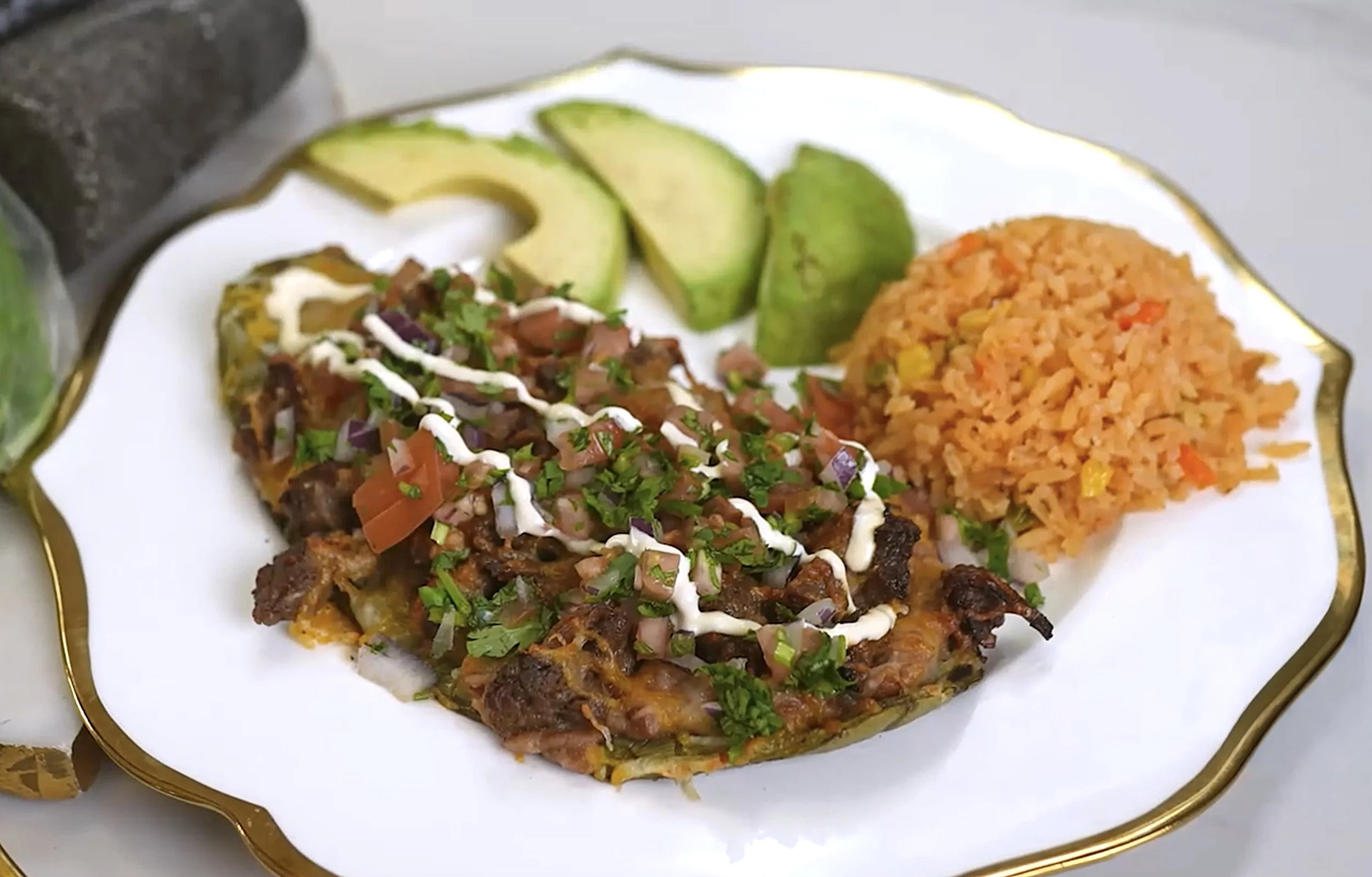 Transfer the huarache to a plate. Top with pico de gallo and Mexican crema. Serve with rice, avocado, and Mexican green onions. Enjoy with bread or tortillas if desired.
